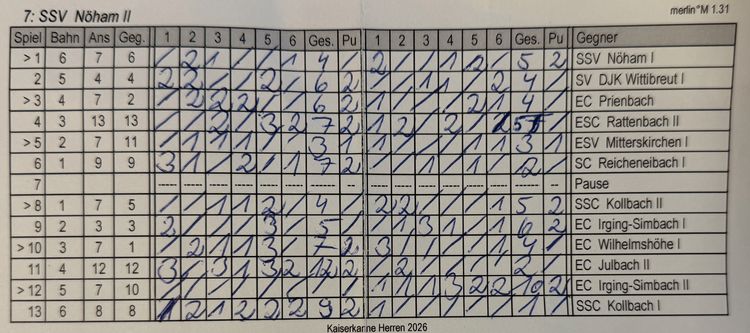 Das Gefühl des "MiaKanntmaHeidGwinga" war für uns damit vorbei. Trotzdem holten wir gegen Wilhelmshöhe, Julbach II und Kolbach I noch 6 Punkte. Einzig gegen den"EC-Huber-Irging-II" waren wir praktisch chancenlos und verhalfen ihnen mit dem 00:10 ungewollt zum Kaiserkannensieg! Siehe Ergebnisliste!